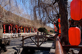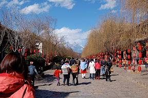 綺麗的古城,紅燈結綵,遠方有白雲藍天,還有皓皓白雪覆蓋的雪山。