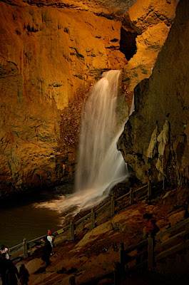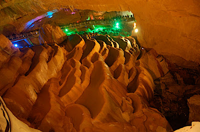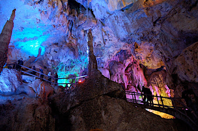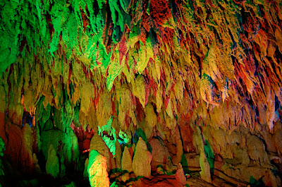 九鄉洞裡面的石頭被打燈照亮得很色彩。