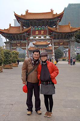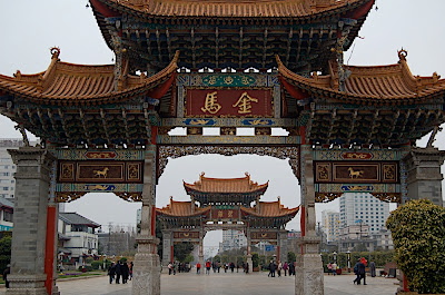 早餐後參觀◎【金馬碧雞坊】;是兩個遙遙相對的牌坊,一個上寫「金馬」,另一個就是「碧雞」。高12米,寬18米,具有典型的昆明民俗特色,雕樑畫棟,精美絕倫,東坊臨金馬山,名金馬坊,西坊靠碧雞山,名碧雞坊。。此兩牌坊是明朝宣德年間的產物,距今至少五百六十多年 ,被譽為昆明的象徵;聽說太陽月亮交輝之時,它們的倒影會互相重疊。金碧廣場屹立於昆明市中心,晚上彩燈映照,景象迷人。