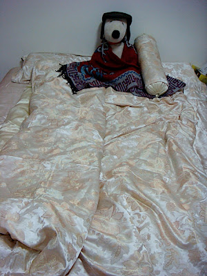 蠶絲被組(我讓史奴比戴帽子、披圍巾、靠抱枕、躺蠶絲好不幸福呀!)