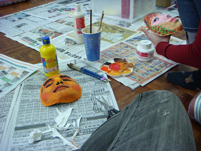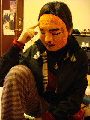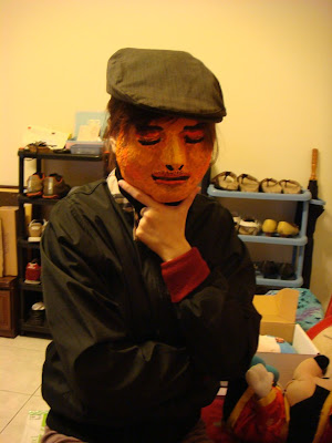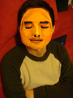 這個面具是用石膏繃帶混著清水、膠水所拼湊而成,所以在打模的時候比較麻煩,需要等待乾燥、成型。接下來就是上色、佈置,不知道該怎麼展現的我,只想到要好好畫一張臉,我以為的幸福就是真實,因此便將所有的色澤、凹凸、深淺描繪上去。老師在觀察進度時,就說這臉真的很像你,當然囉!因為是用我的大臉去塑造,所以顏色塗上去後,很像是必然的結果。